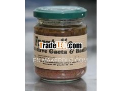 Pate of olives in extra virgin olive oil.Pate of tipicals olives di Gaeta and basel in extra virginolive oil.