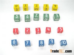 1 red 2cm cube, numbered 0-5; 1 blue 2cm cube, numbered 5-10; 1 yellow 2.5cm cube, numbered 0 TENS - 5 TENS; 1 green 2.5cm cube, numbered 5 TENS - 10 TENS