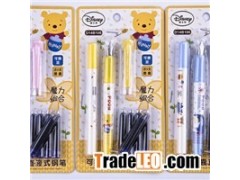 Plastic Fountain Pen Filled With Erasable Ink Item no.: TPF1027. Blister card package combined with one plastic fountain pen, one eraser pen and 5pcs ink cartridges. Ink is erasable by the chemical eraser pen. The best calligraphy choice among writing collections for students.