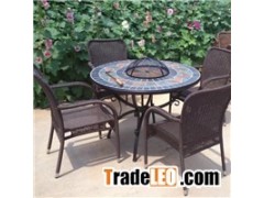 Round Fire Pit BBQ Table Set With Slate Top Bowl Cover Mosaic Table With Four Rattan Arm Chair