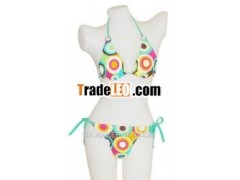 swimsuit woman bikini, 2 pieces, color circles - made in Thailand,80 % polyamide, 20 % lycraswimsuit woman bikini, 2 pieces, color circles- made in Thailand, 80 % polyamide, 20 % lycra- thin lining in cotton in the top and bottom- 2 metal rings in metal on the front- Adjustable halter bikini top ties at neck and back and hasadjustable cups for more or less coverage- many sizes available : S till XXXL- many colors avalaiblewomen's swimwear bikini